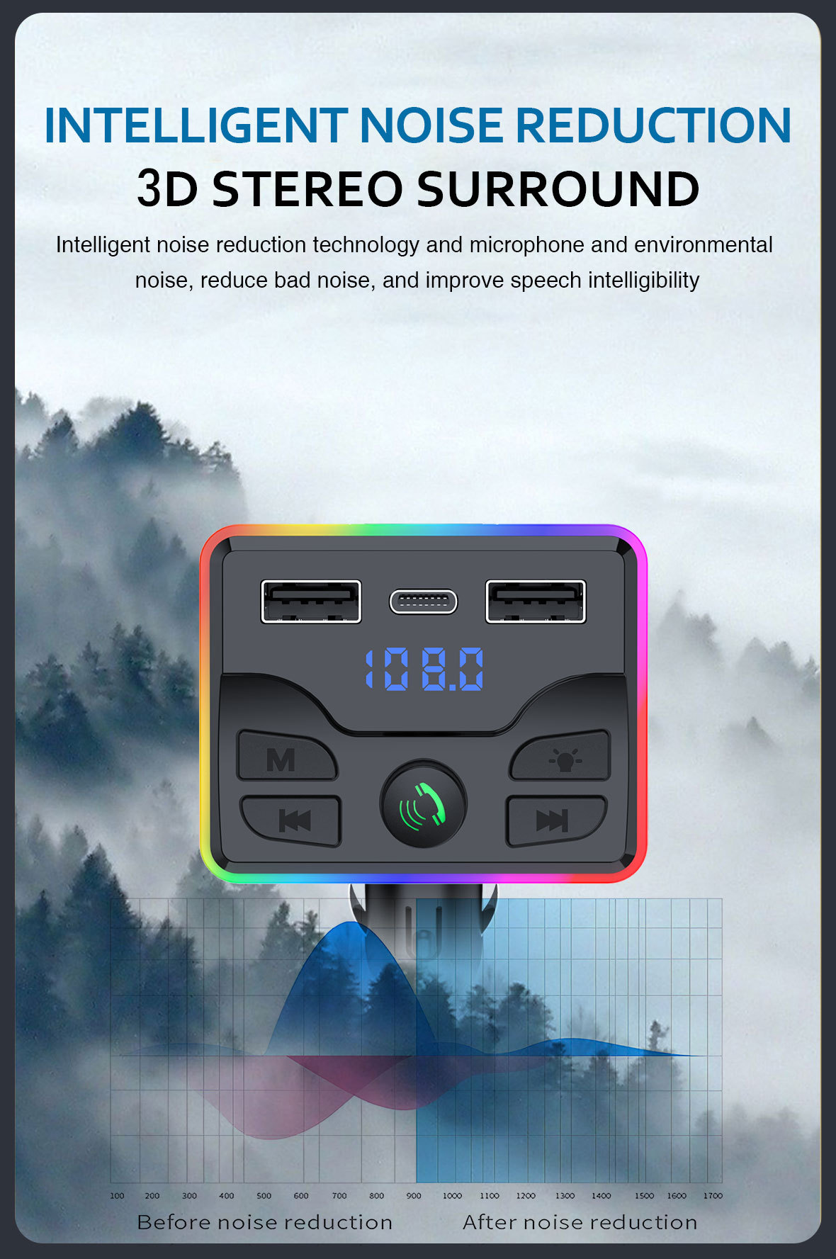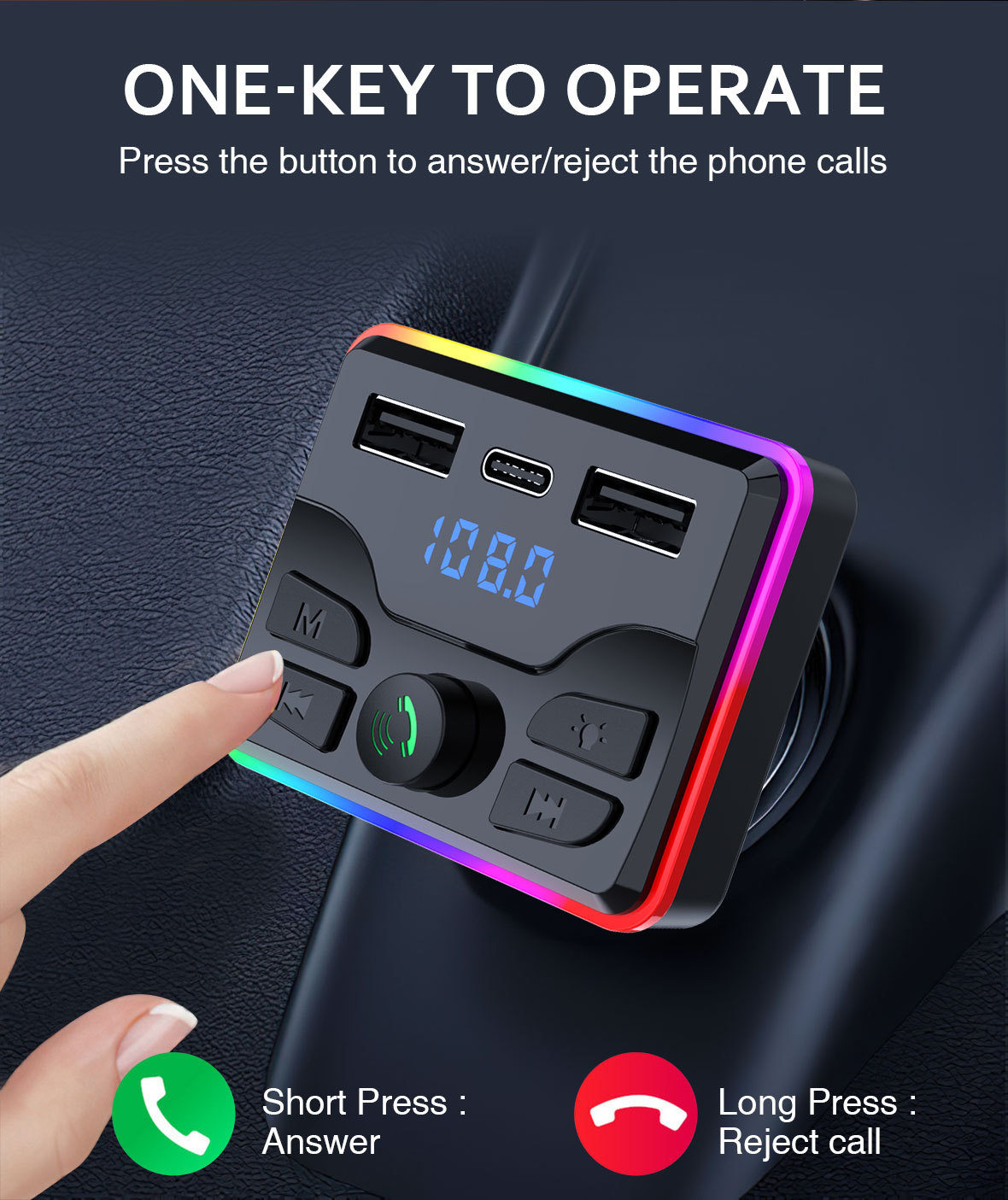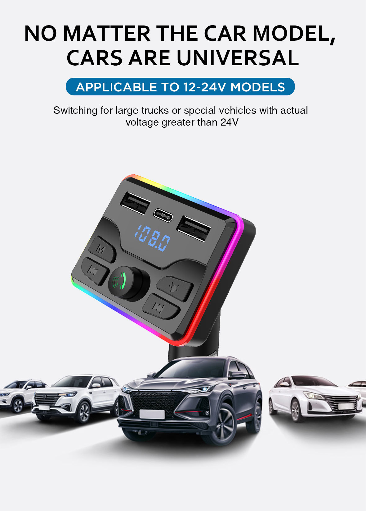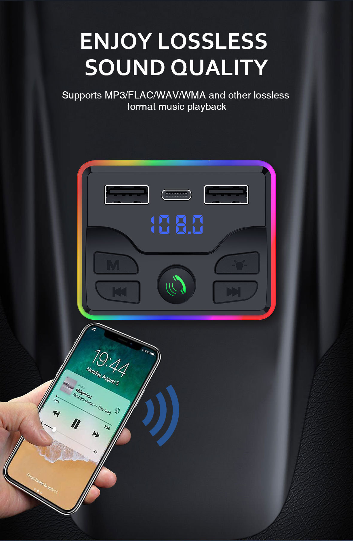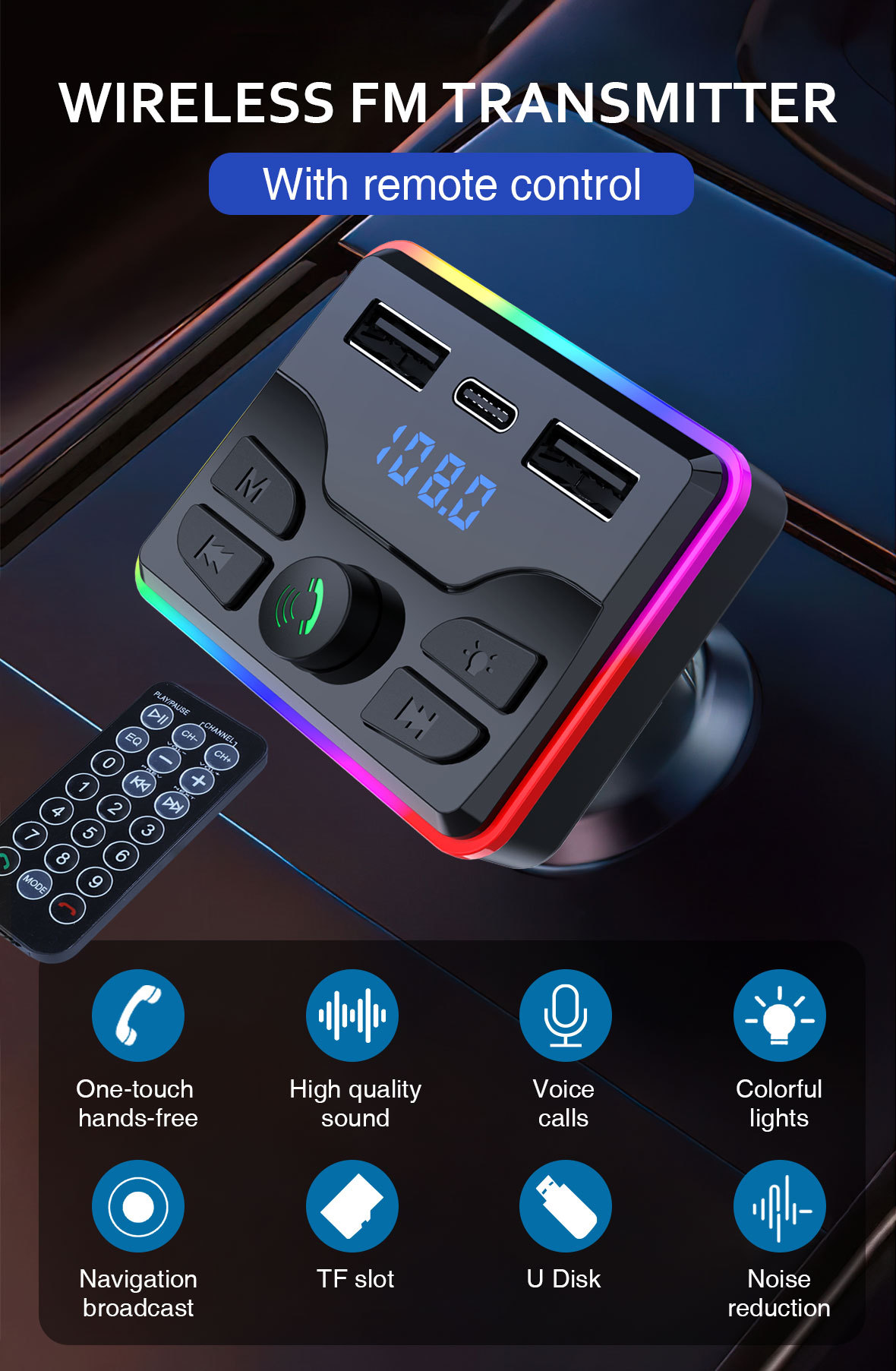 ATCBS1015 Car MP3 Player with FM Radio USB TF Card Remote Control Type-C 7-Color Lights for 12-24V Cigarette Lighter Power
